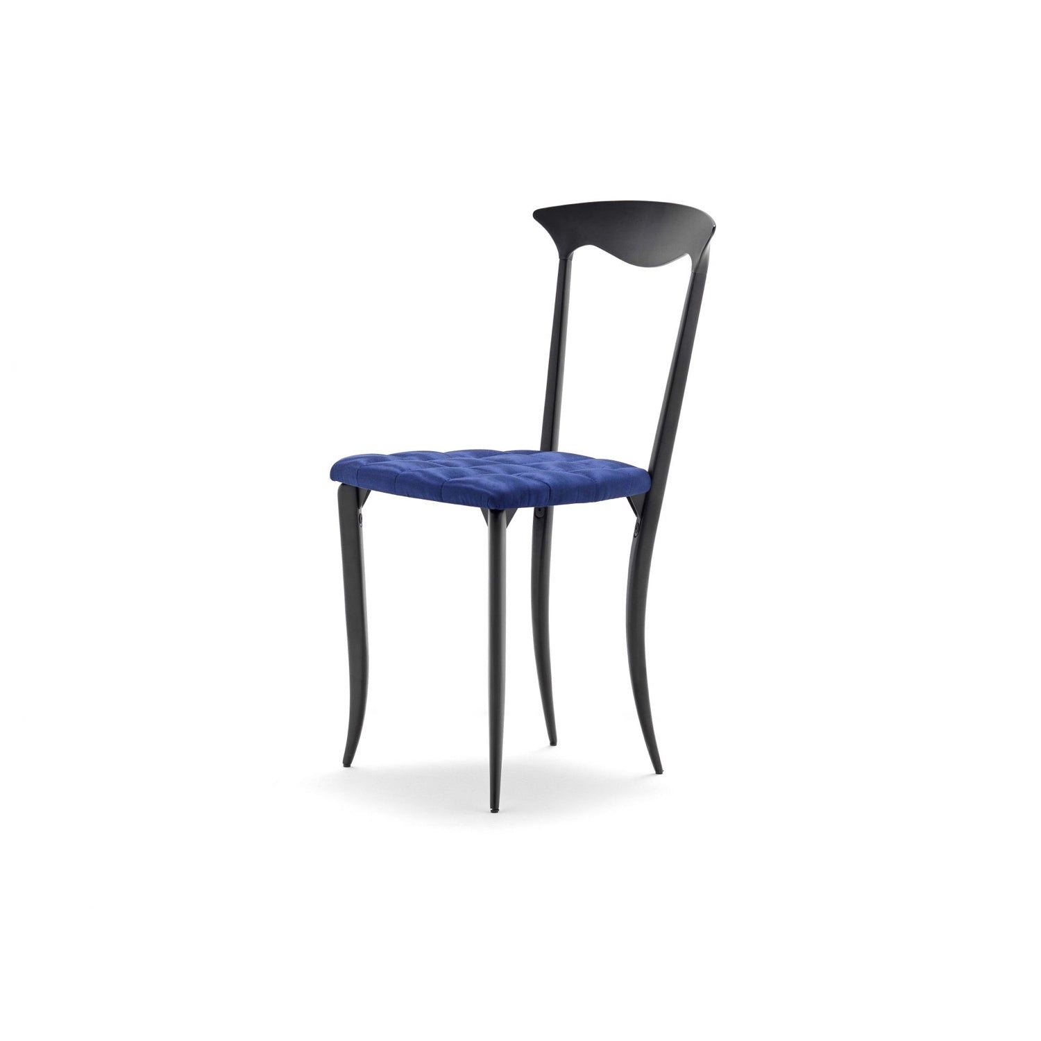 Charme is a dining chair with a die-cast aluminium frame and backrest available in various finishes. It is available in two versions: with fasem premium matelassé leather or Dedar® amoir libre matelassé fabric upholstered seat.