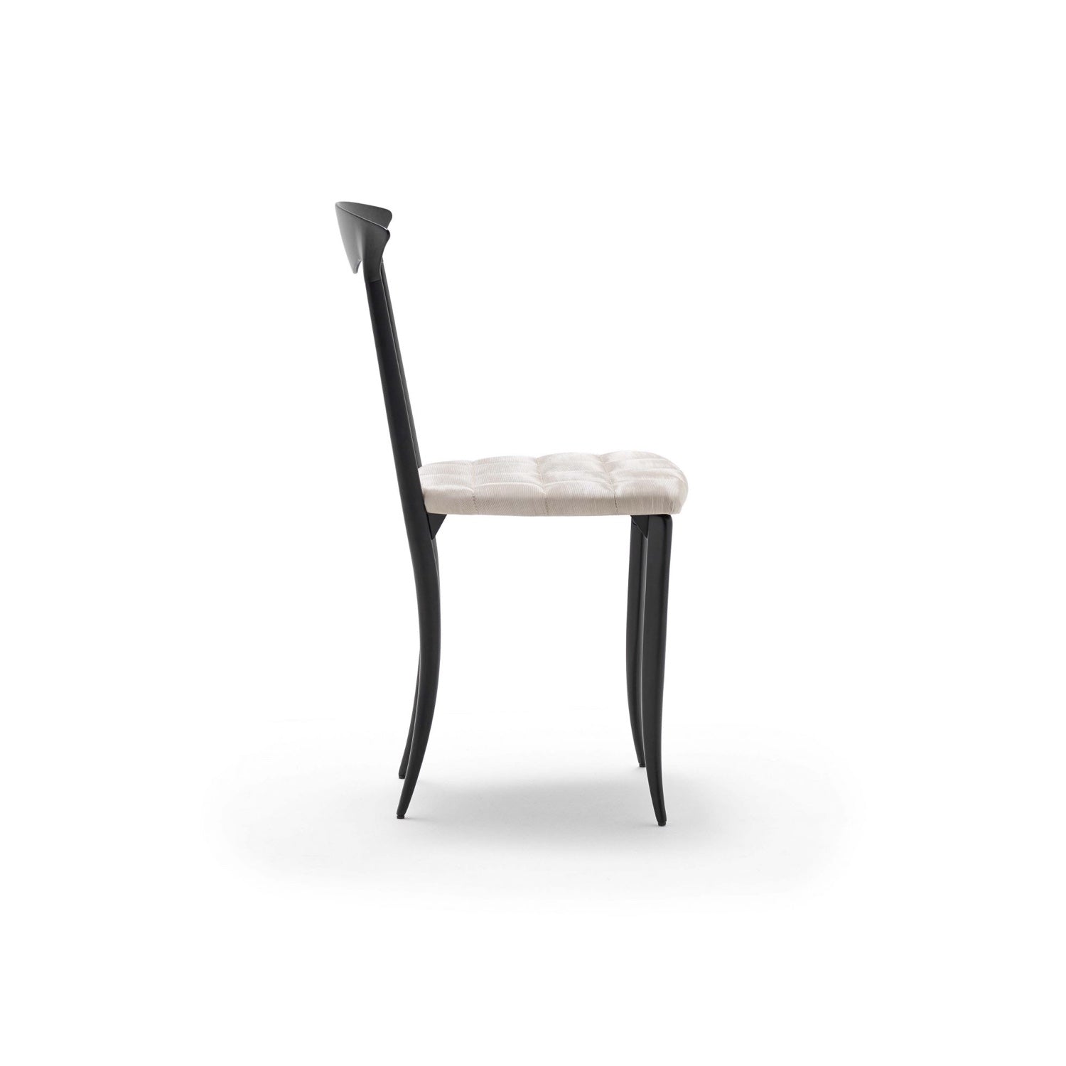 Charme is a dining chair with a die-cast aluminium frame and backrest available in various finishes. It is available in two versions: with fasem premium matelassé leather or Dedar® amoir libre matelassé fabric upholstered seat.