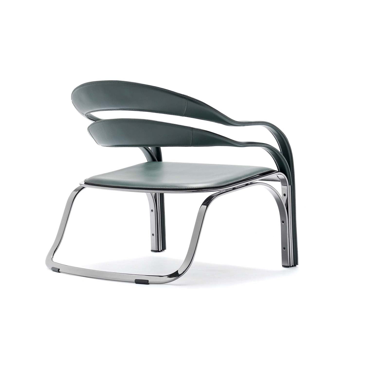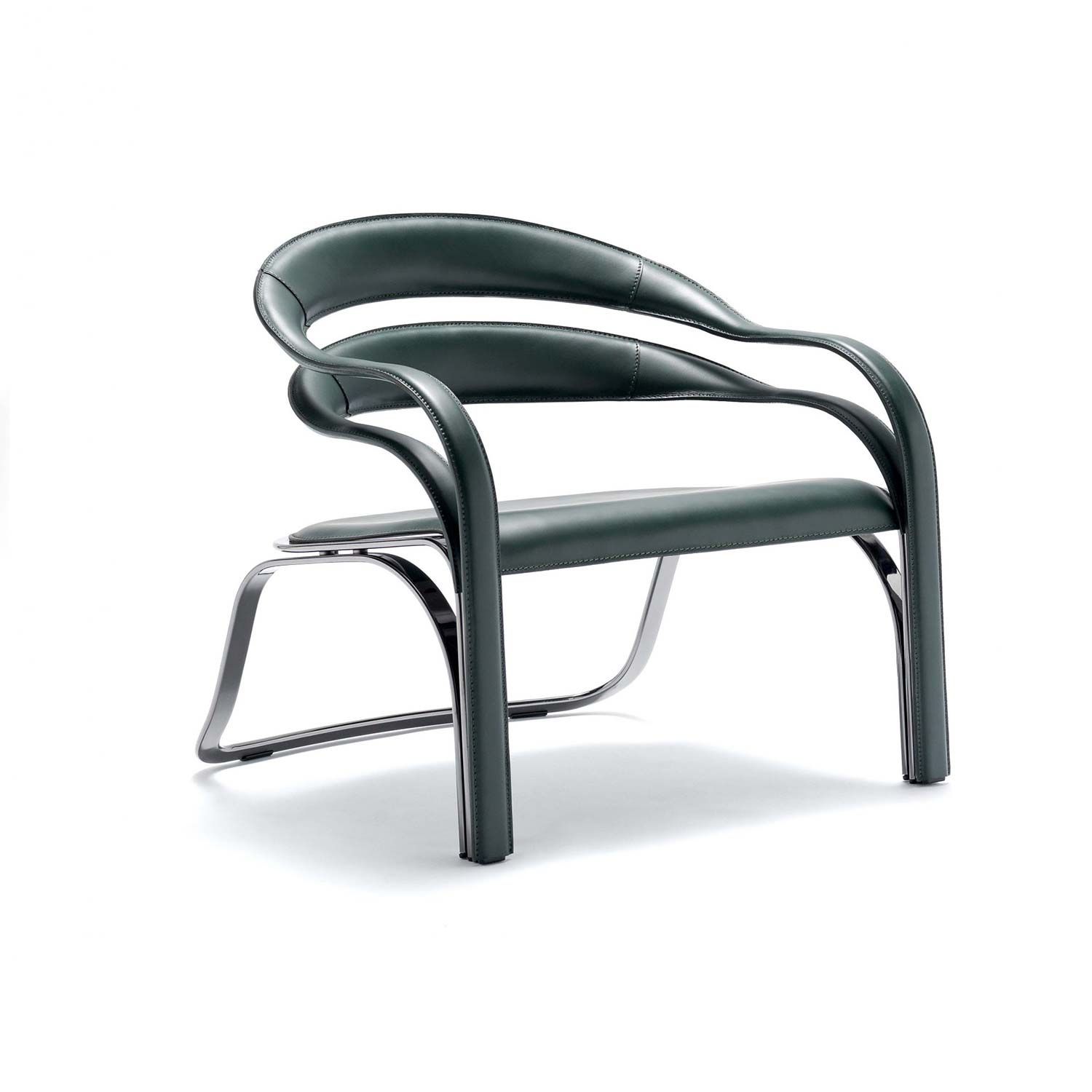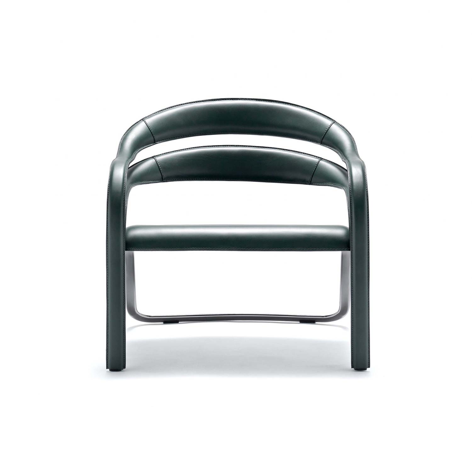 Fettuccini W is a lounge chair with a flexible steel frame in various finishes. The seat, double backrest and armrests are lightly padded and covered with fasem full-grain leather or fasem premium leather. The armrests are upholstered with fasem full-grain leather or fasem premium leather with a special detail that runs down the front to the floor. Fitting for both homes and in the waiting rooms of studios and companies.