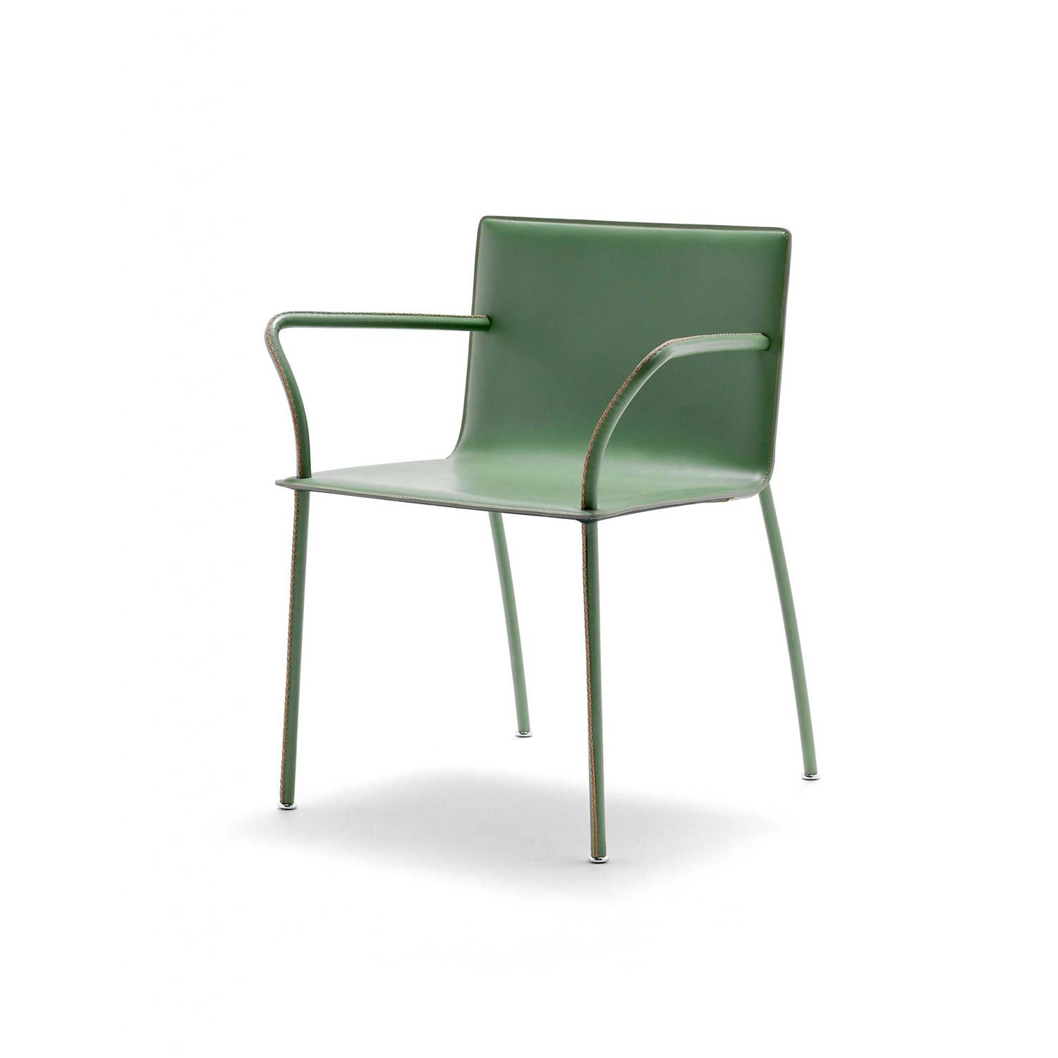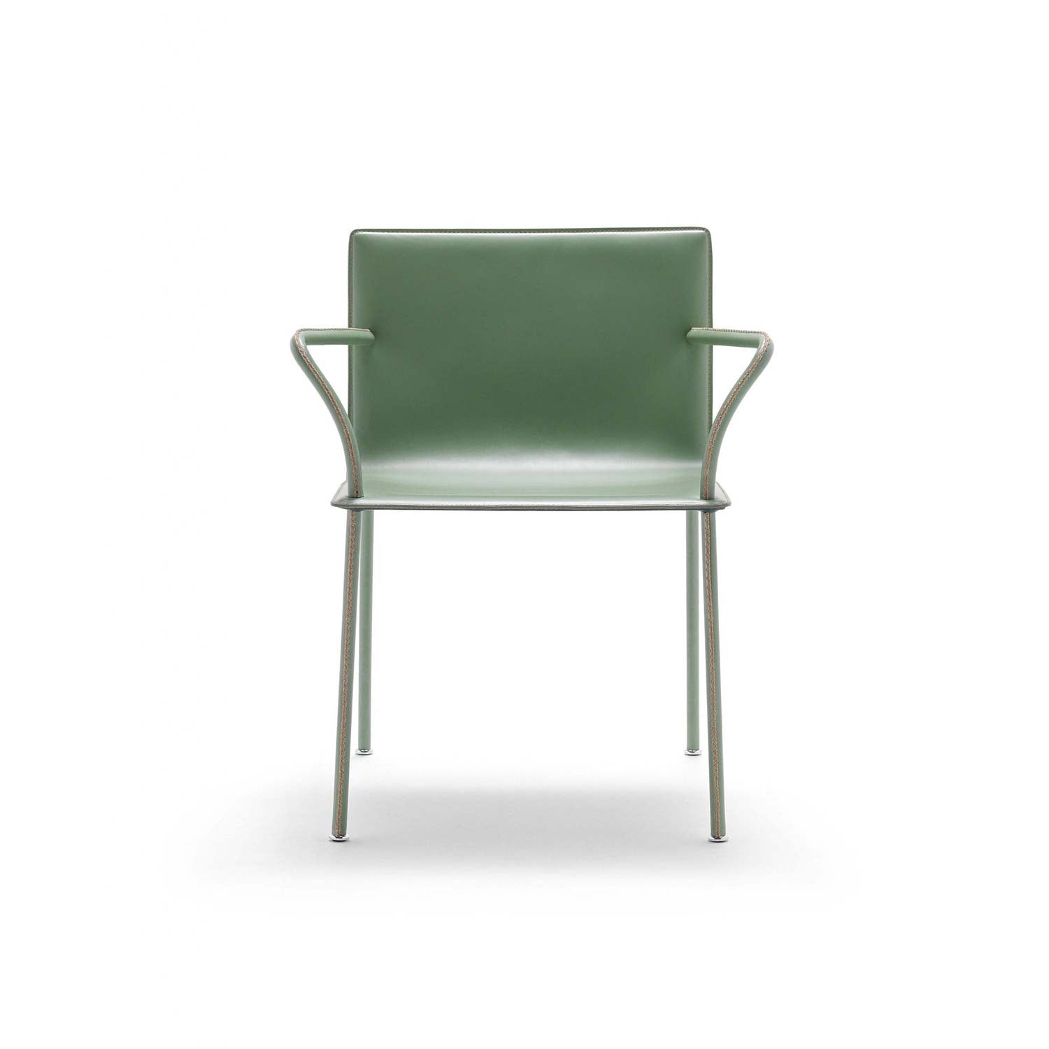 Lys P is a dining armchair with a steel frame in various fasem finishes fully upholstered with fasem full-grain leather or fasem premium leather, with contrast stitching. Also suitable for office use in the waiting room or in front of a desk. The craftsmanship is evident in the hand-finishing, cutting and stitching of the whole upholstery, from the seat to the armrests and the legs.