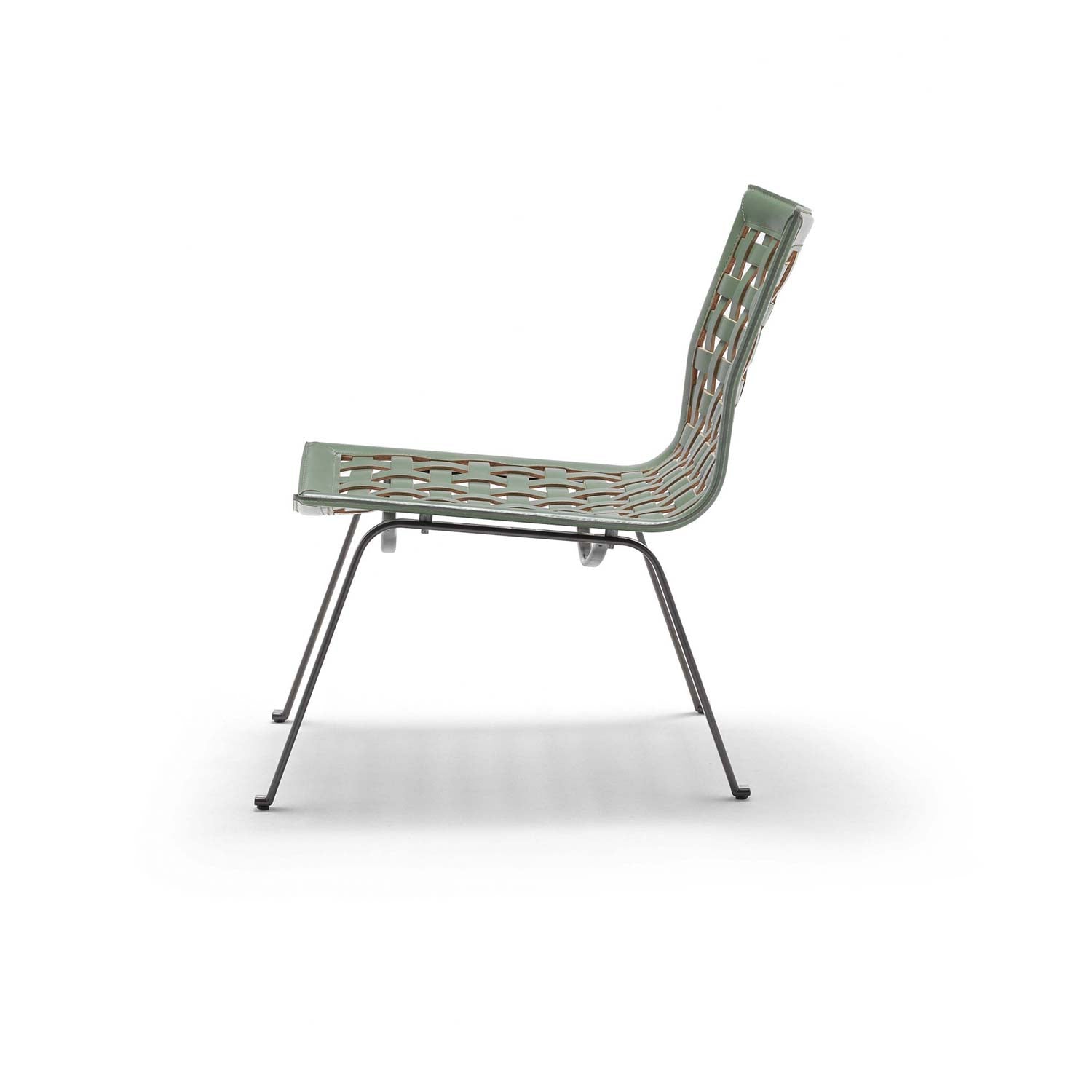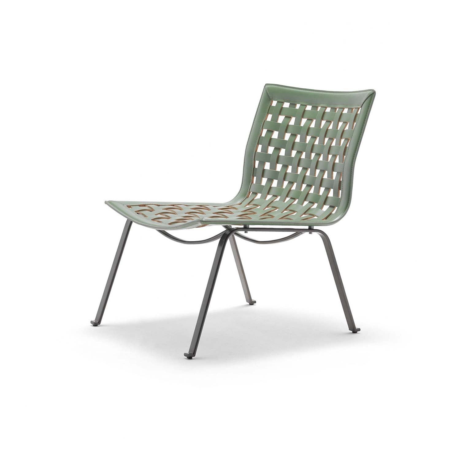 Net W is a lounge chair with a steel frame in various fasem finishes, and a seat and backrest made entirely of interwoven fasem full-grain leather. The visible cut of the weaves highlights the quality of the fasem full-grain leather, which displays a warm colour scheme. The manual craftsmanship together with the high-quality materials make this an immediately recognisable and impactful armchair.